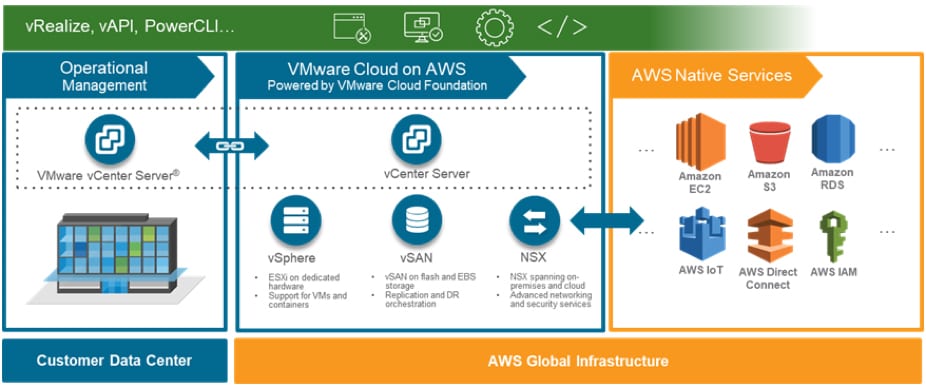 VMC is fully supported and integrated with other VMware solutions like NSX, vRealize and Site Recovery Manager. Because it is a real VMware data center/cluster, it is mostly treated in the same way an on-premises data center operates, with the exception of management responsibilities.