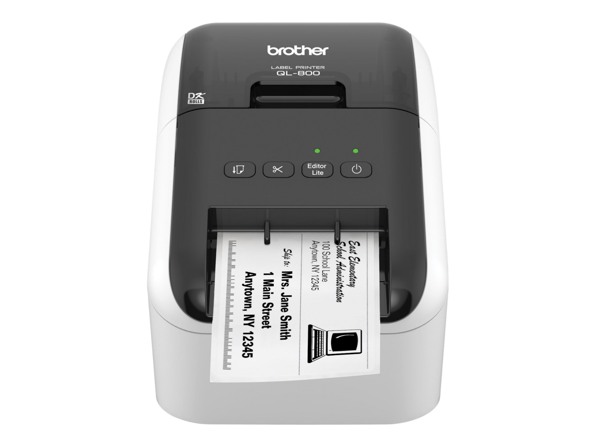 Professional, high-speed label printer helps you quickly tackle labeling tasks in your busy office. Create amazing Black/Red labels using DK-2251 or cost-effective paper labels for packages, envelopes, file folders, name badges, postage and more. The super-fast, printing up to 93 standard address labels per minute with black text at 300dpi help save time on big projects. An auto cutter allows for printing or multiple labels at a time, eliminating wasted label sheets. The "Plug & Label" feature supports quick label printing of most basic labels - no software installation required for Windows PCs. P-touch Editor software for Windows and Mac lets you create labels as you desire. Print from Microsoft Word/Excel /Outlook. Uses convenient, Brother genuine DK drop in labeling supplies. Needs no ink or toner.